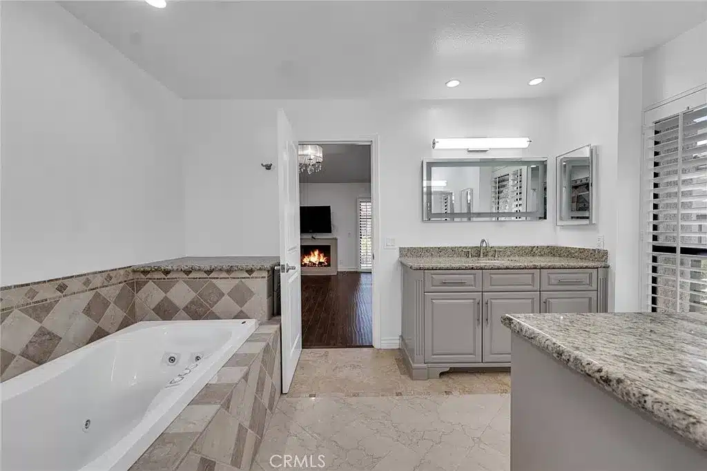 The master suite is updated with his and hers vanities, granite countertops and bathtub and separate showers.