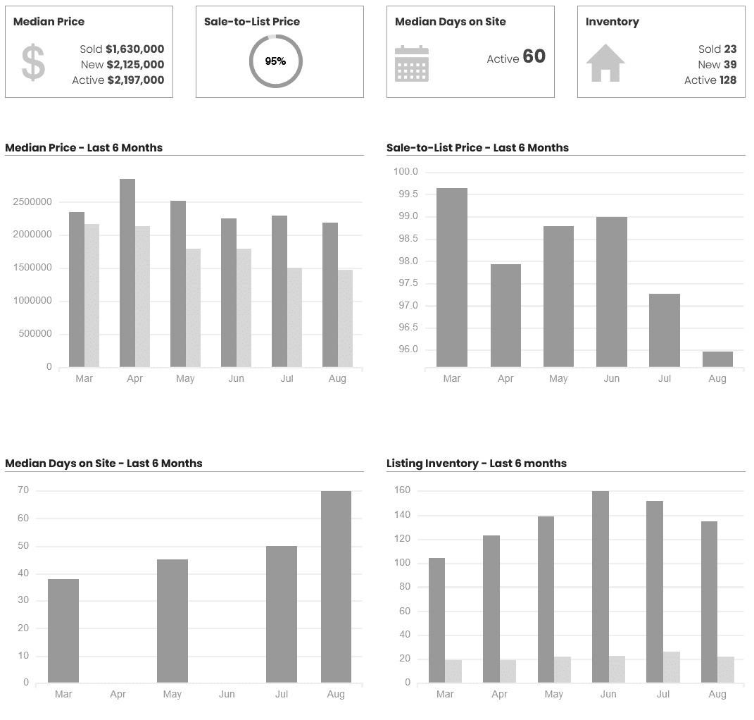 The sale-to-list price ratio fell to 95% in August, down from 97.3% in July, showing that buyers are negotiating more aggressively. Homes are taking longer to sell, with the median days on site increasing to 60 in August, up from 50 days in July. Inventory remains high, with 128 active listings and 23 homes sold in August, compared to 147 active listings and 26 sold in July.