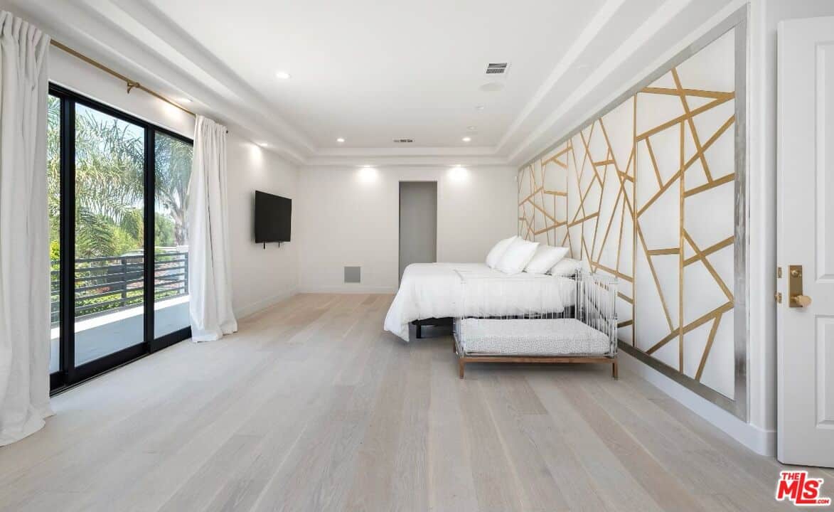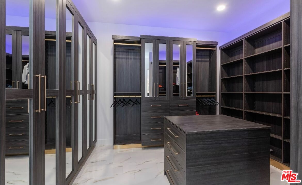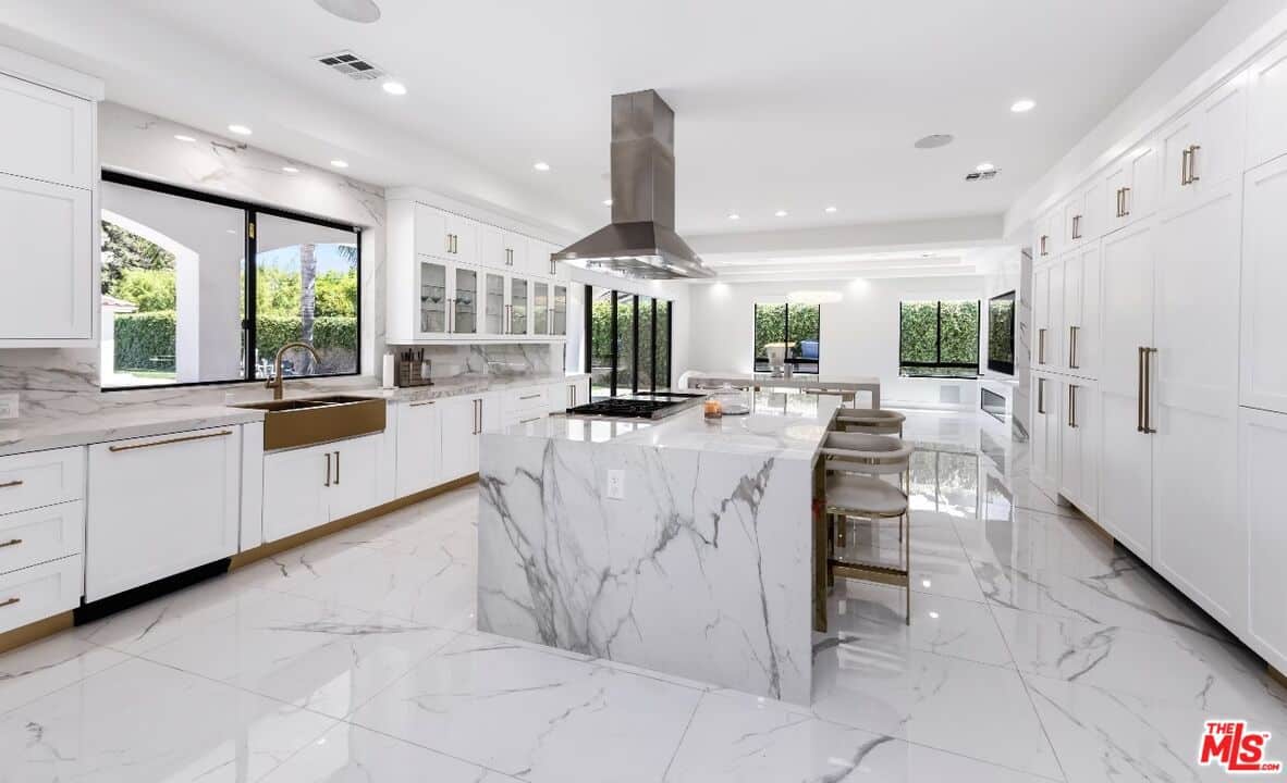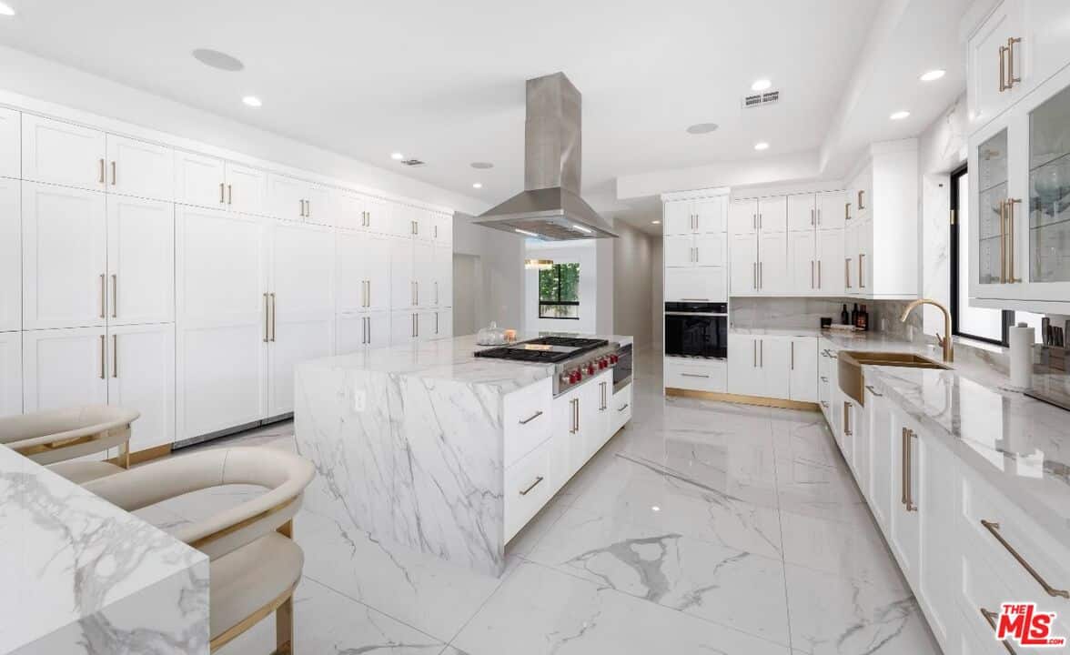 Dine in style in the sophisticated formal dining area under a mesmerizing circular chandelier offering its dazzling light to all who reside. The Woodland Hills Estate sets a unique standard of luxury living. The open chef’s kitchen shows off pristine white cabinetry and top-of-the-line Wolf appliances, inviting you to create culinary delights.