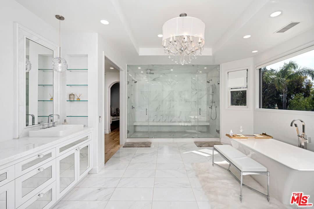 The primary suite of this luxurious abode features two generously-sized custom closets, a steam shower, a tub, and a fireplace.