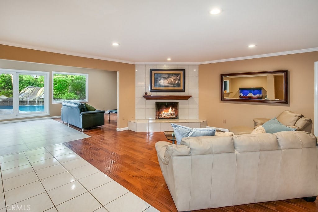 Featuring elegant crown molding, recessed lights, a floor-to-ceiling raised hearth custom tiled fireplace with mantle, and gleaming hardwood floors in the formal living room.