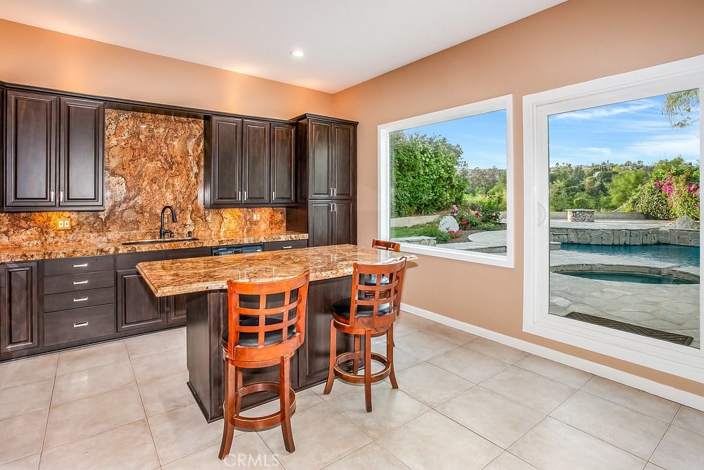 There’s also a large complementary granite crowned center island/breakfast bar; Plus access to the backyard through sliding glass doors – all in an easy care tiled floor setting.