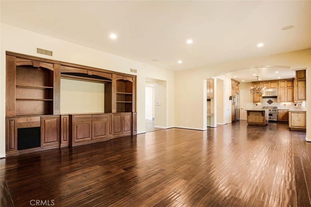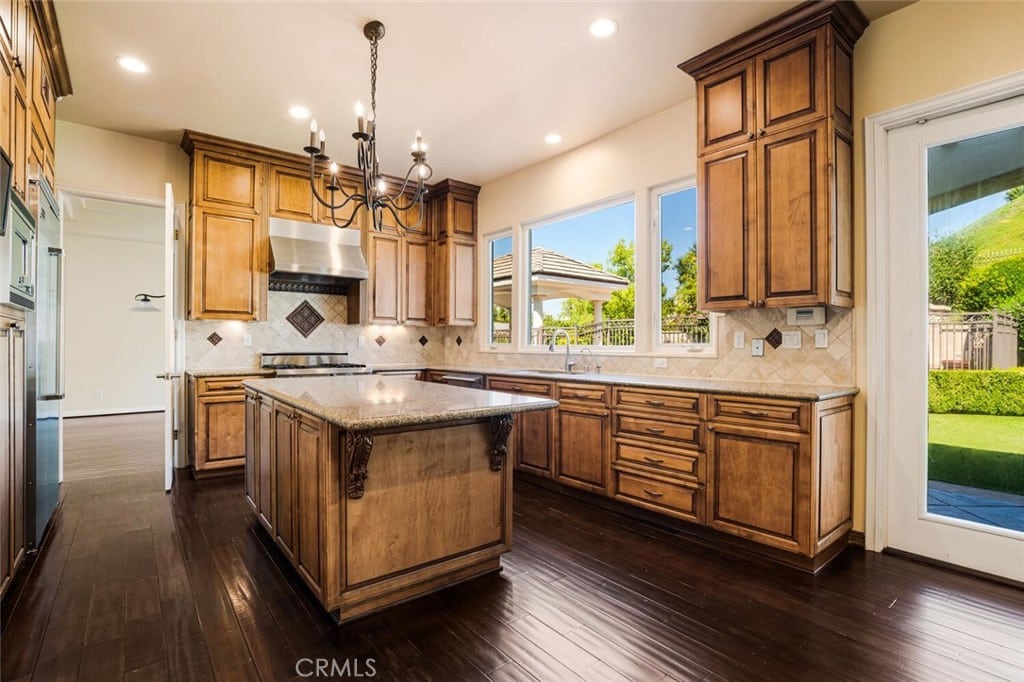 The house boasts high ceilings and elegant wood floors, creating an inviting atmosphere. The top-of-the-line kitchen is a chef’s dream, equipped with Viking appliances, a spacious center island, and an open layout connecting it to the expansive family room, complete with built-in cabinets and a cozy fireplace.