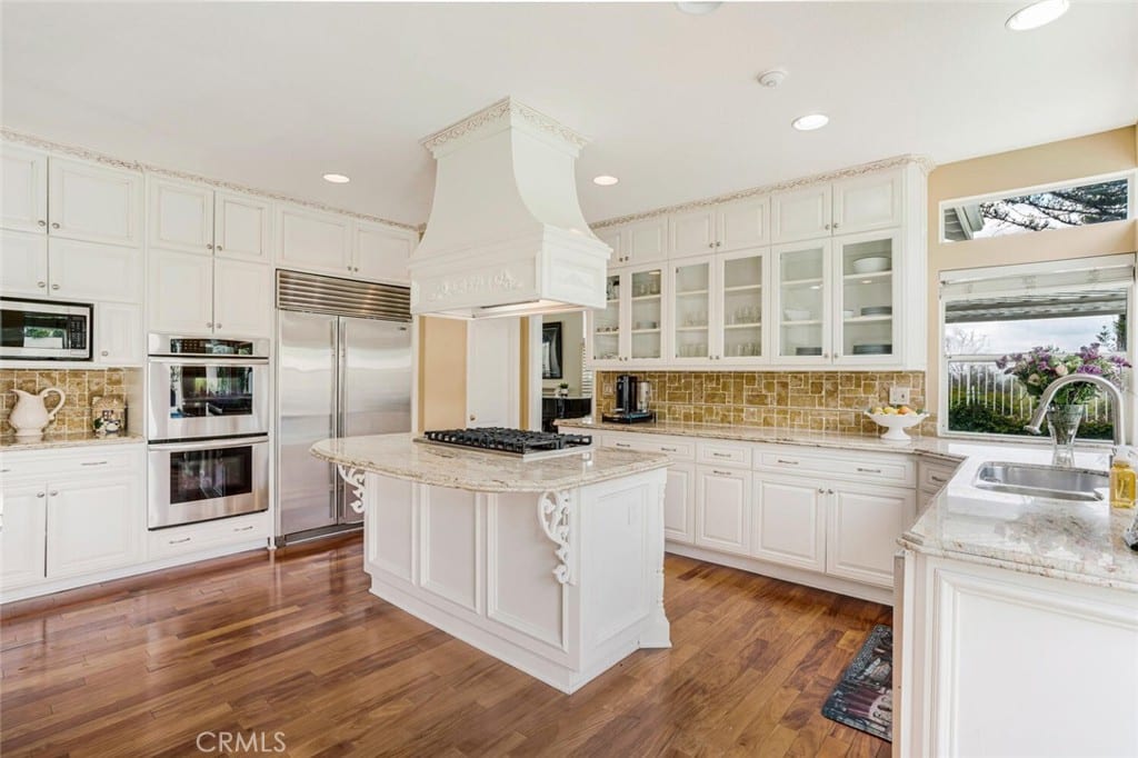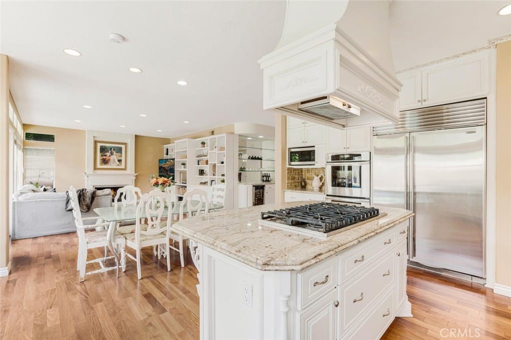 The Country French style kitchen features Sub Zero fridge, Thermador double oven, Viking cooktop in the center island, and granite countertops. Beyond that is an oversized family room to host guests in comfort.