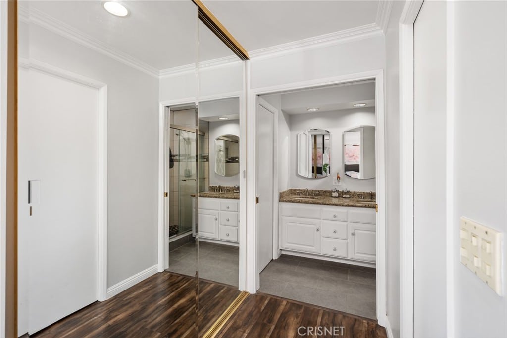 There are four other bedrooms that are spacious; three of which include ceiling fans while two have closets with mirrored doors. The hall bathroom features a tub/shower combo tiled walls & glass door accessorized by hand held shower head for convenience; dual sinks adorn Caesar stone countertops plus wooden encasinig below.