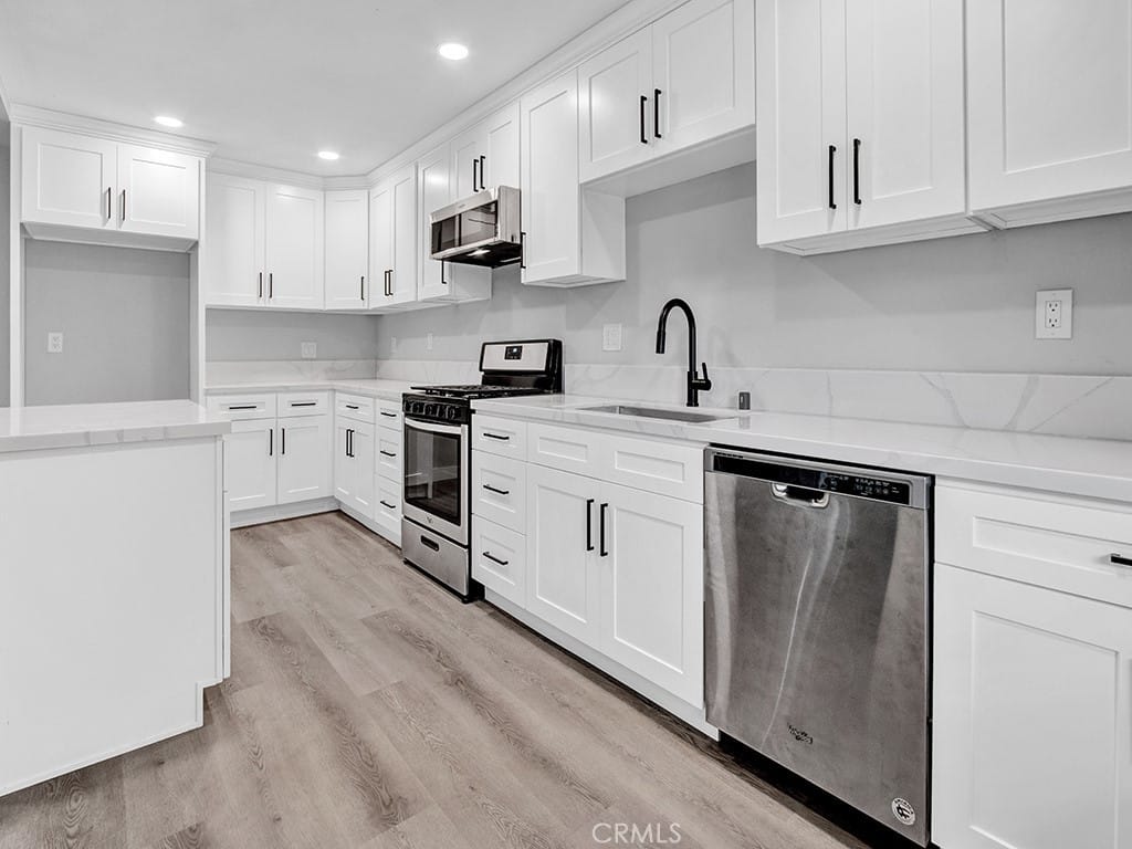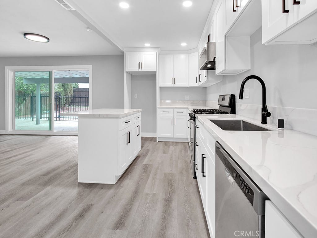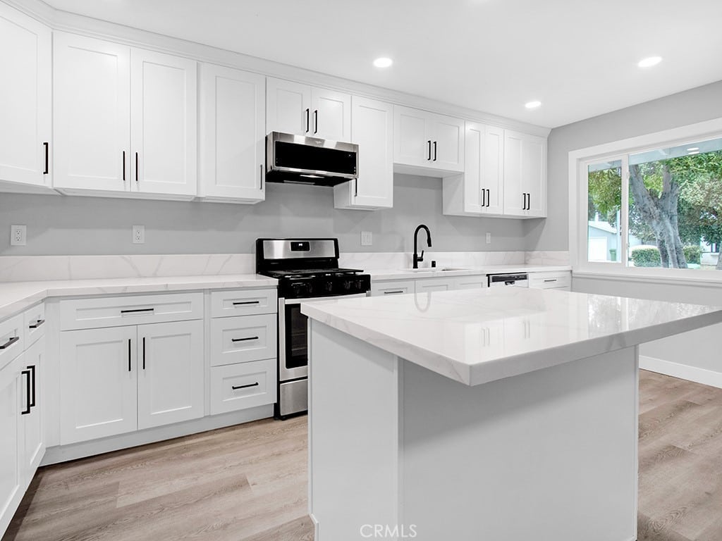 New cabinets, countertops, and appliances have been installed in the kitchen.