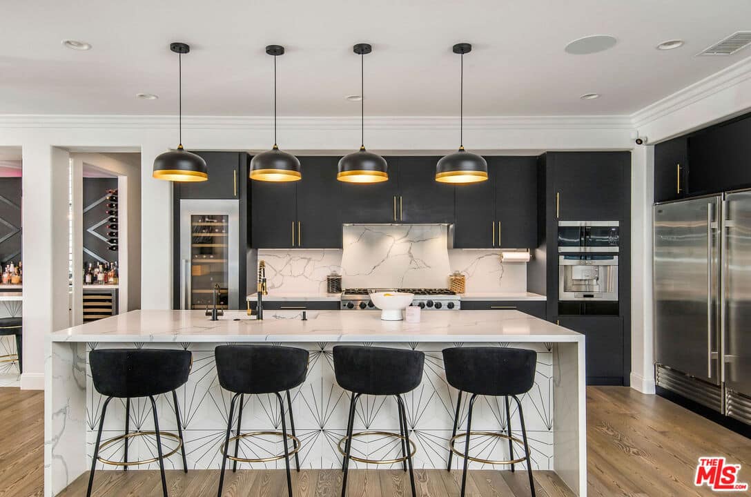 Inside, the home is a masterpiece of modern elegance, blending artistic design with sophisticated style. The expansive family room, adorned with a custom modern fireplace, seamlessly flows into a cutting-edge kitchen complete with a waterfall stone island and a stunning backsplash.