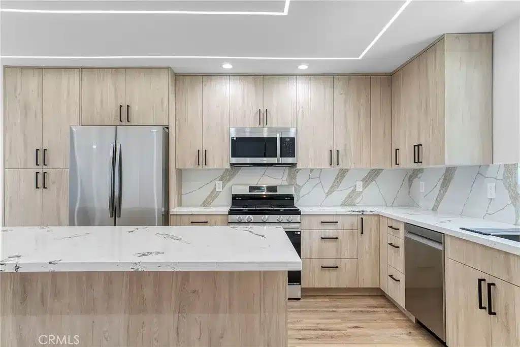 The bright and airy living space flows seamlessly from the living room to the dining area, kitchen, and family room—creating a cohesive and inviting environment. The remodeled kitchen features sleek modern lighting, abundant cabinetry, and a stunning oversized island that opens to the dining area, making it the heart of the home.