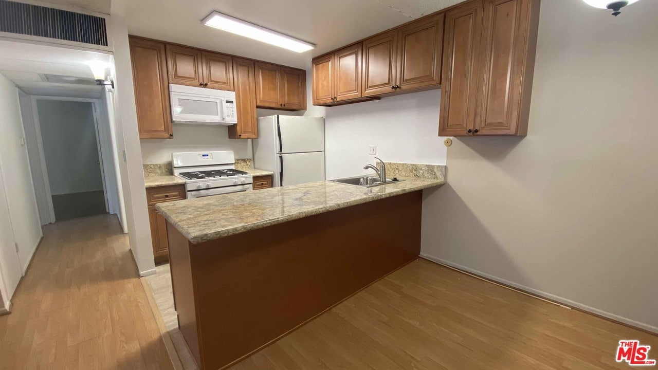 This Renovated Canoga Park Condo features a brand new kitchen with high-quality cabinets and granite countertops, new tile flooring, fresh paint throughout, new laminate flooring in all the bedrooms, updated lighting in the kitchen and bathrooms, and a new high-quality shower door.