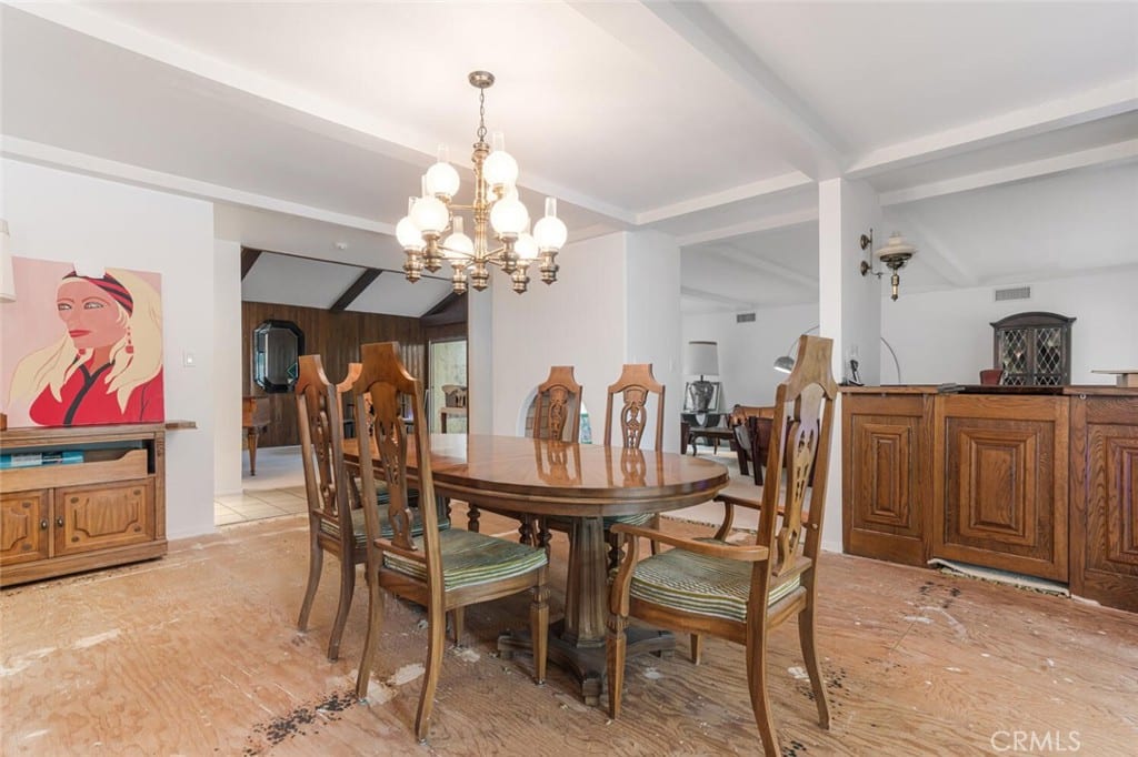 The living room offers oak paneled walls, vaulted & beamed ceilings and a vintage open-frame wall, while the dining room provides a double-sided fireplace which backs to the family room/ den – complete with retro vibe bar!
