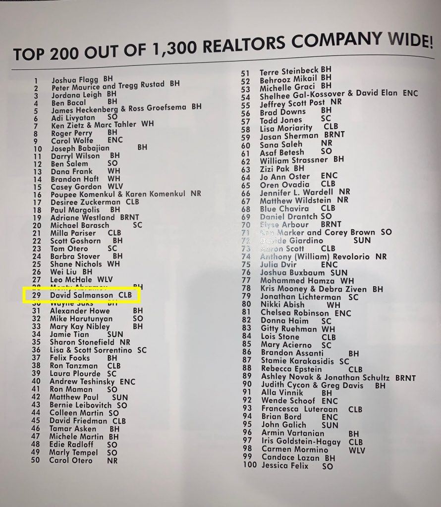 Up there with the best of the best! Close to 19 Million in sales for 2018 for David Salmanson. With over 1,250 Realtors at Rodeo Realty David is #3 in the Calabasas office and #29 for all of the company!