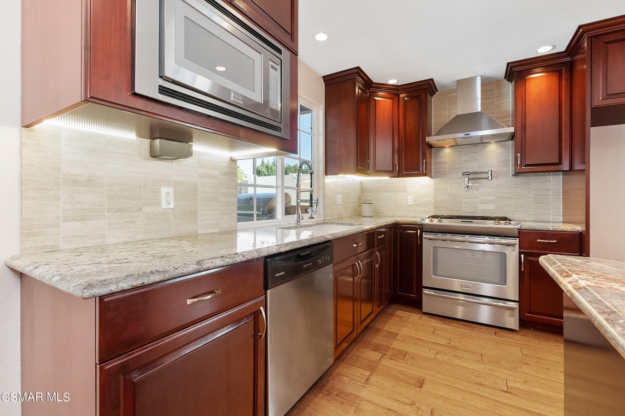 Totally upgraded and updated, this floor plan will have you falling in love the minute you step foot inside. The open entryway with vaulted ceilings and a decked out fireplace flows easily into the kitchen with an amazing view of the backyard oasis. There is beautiful cabinetry, slab granite counters, island seating, stainless steel appliances, and a pot filling stove faucet in this kitchen! There is also a separate dining area off the kitchen space in this Simi Valley Dream Home. There is wood flooring throughout the living space and down to the bedrooms and the hall bath.