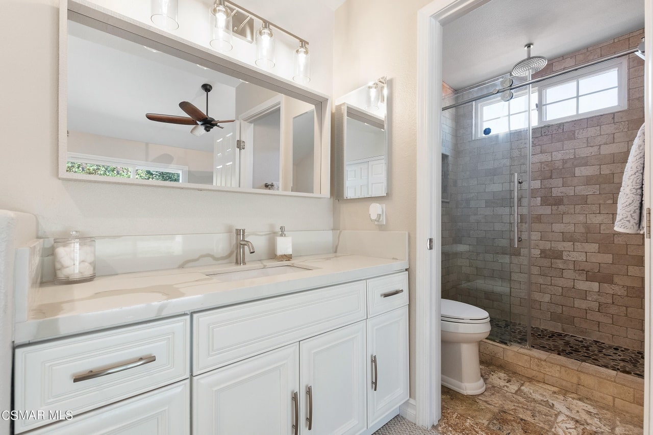 These 3 bedrooms were recently renovated with new Berber style patterned carpeting, ceiling fans, window shutters and moulding details to make them look good. A bright white tub and shower combo with glass door, quartz countertop vanity, and modern fixtures are part of the shared hall bath. This Simi Valley dream home features a vaulted ceiling, dual closets, a vanity area with quartz counter top, modern fixtures, a separate shower and toilet room, as well as a rear slider access door.