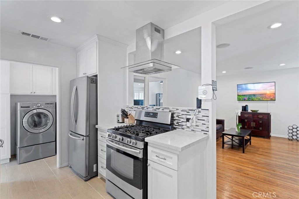 Step into the living room, equipped with built-in Bluetooth speakers, and take in the custom kitchen cabinets, marble counters, and Samsung Stainless Steel appliances.