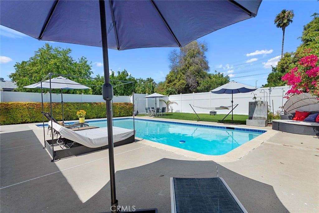 The updated bathroom features marble counters, double sinks, and a built-in Bluetooth speaker. Outside, enjoy the large backyard with a re-tiled pool, covered patio for entertaining, and plenty of space for gardening or relaxation. Complete with a newly-installed front gate for privacy and an attached 2-car garage.