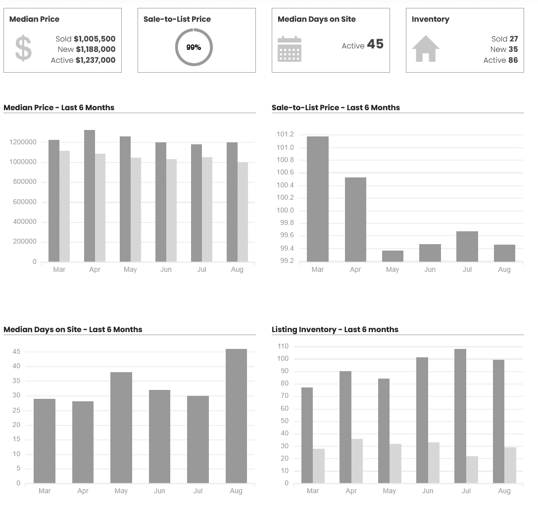 The sale-to-list price ratio edged down slightly from 99.2% in July to 99% in August. Homes are taking longer to sell, with the median days on site climbing to 45, up from 30 days in July. Inventory shifted as well, with 86 active listings and 27 homes sold in August, compared to 108 active listings and 22 sold in July.