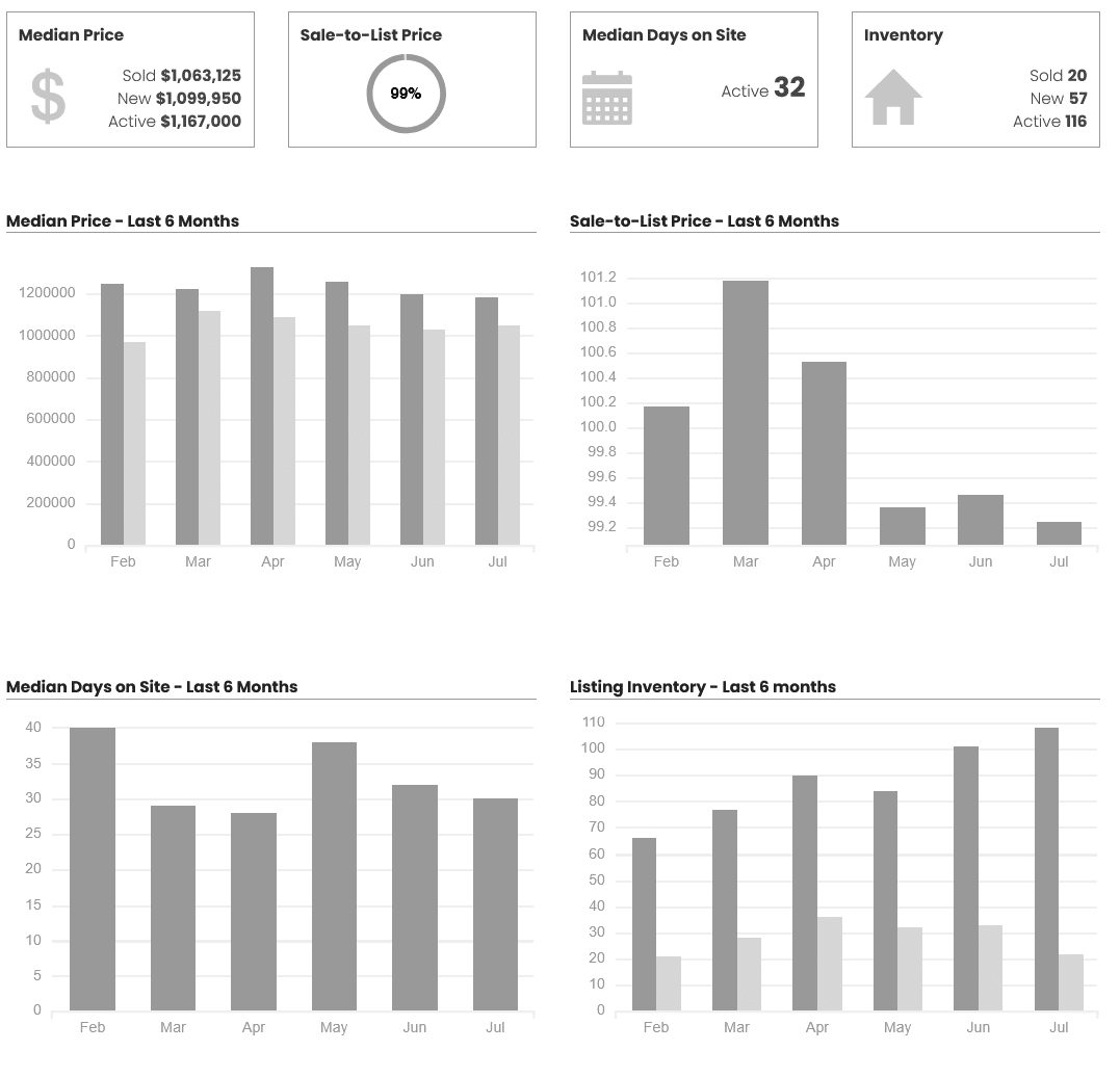 The West Hills real estate had mixed number in July showing both a rise and a fall. The median sold price in west hills increased to $1,063,125. Up $33,125 from June. The new listing prices rose as well to $1,099,950 which is a $39,950 gain. Active listings dropped to $1,167,000 which is $33,000 down from June. The sale-to-list price ratio went down slightly to 99.2% from 99.5%. Inventory increased with 116 active listings and 20 homes sold.