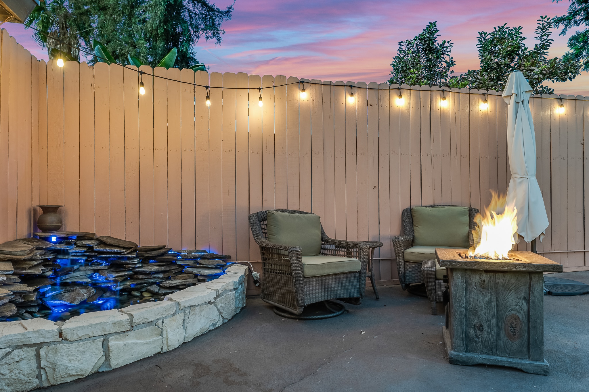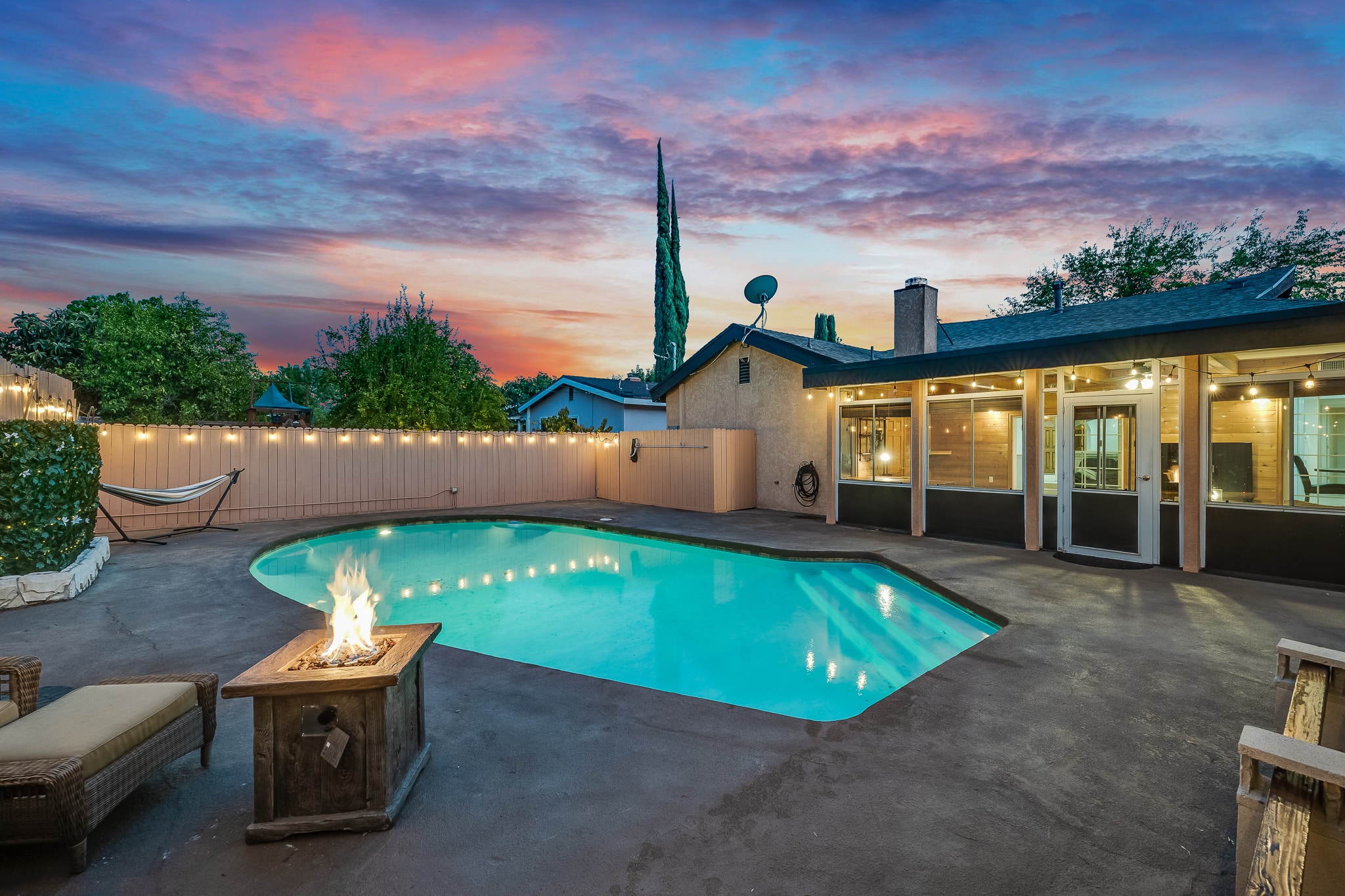 The outside has a beautiful backyard with a pool, a fire pit and a detached garage.