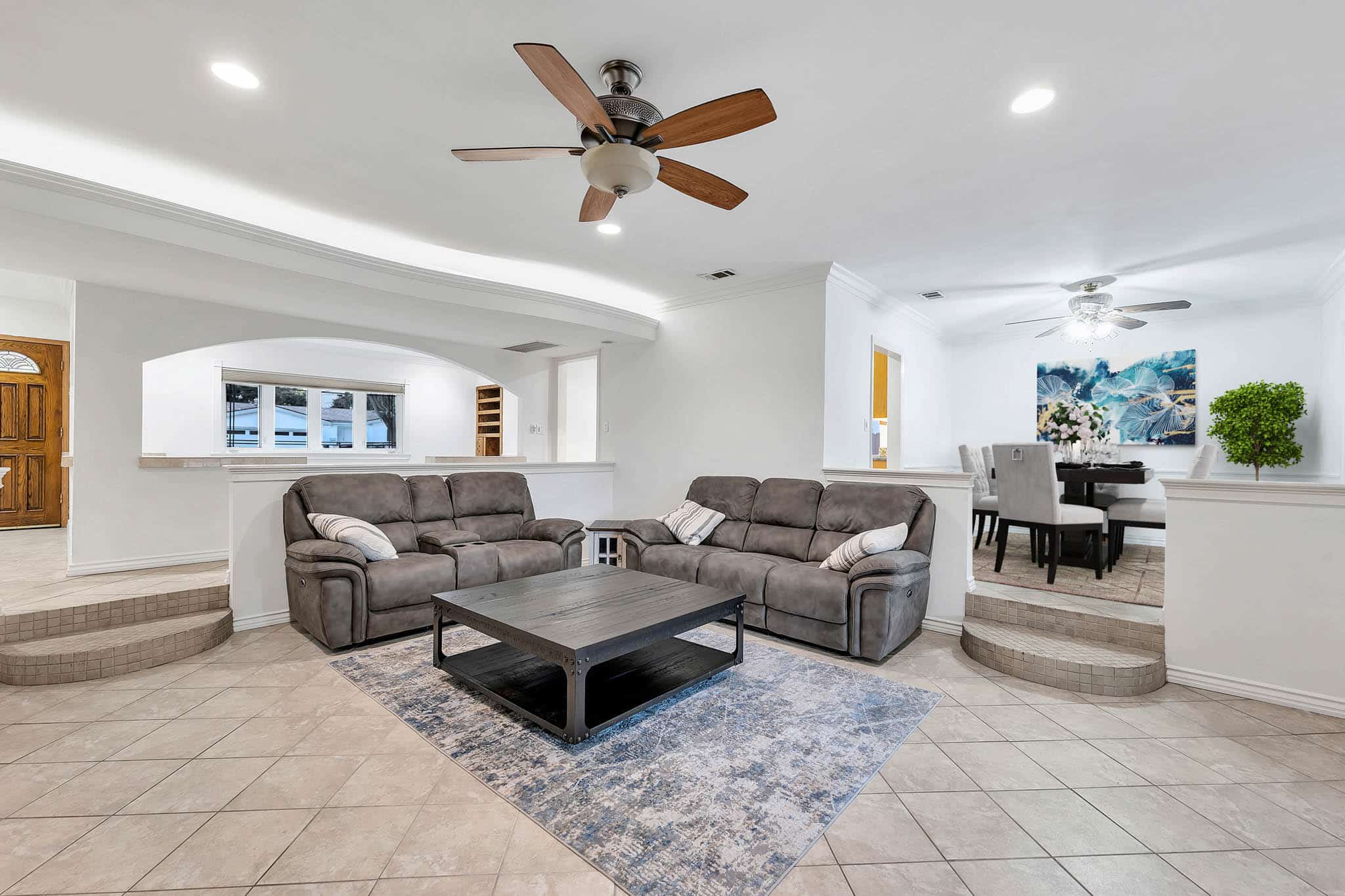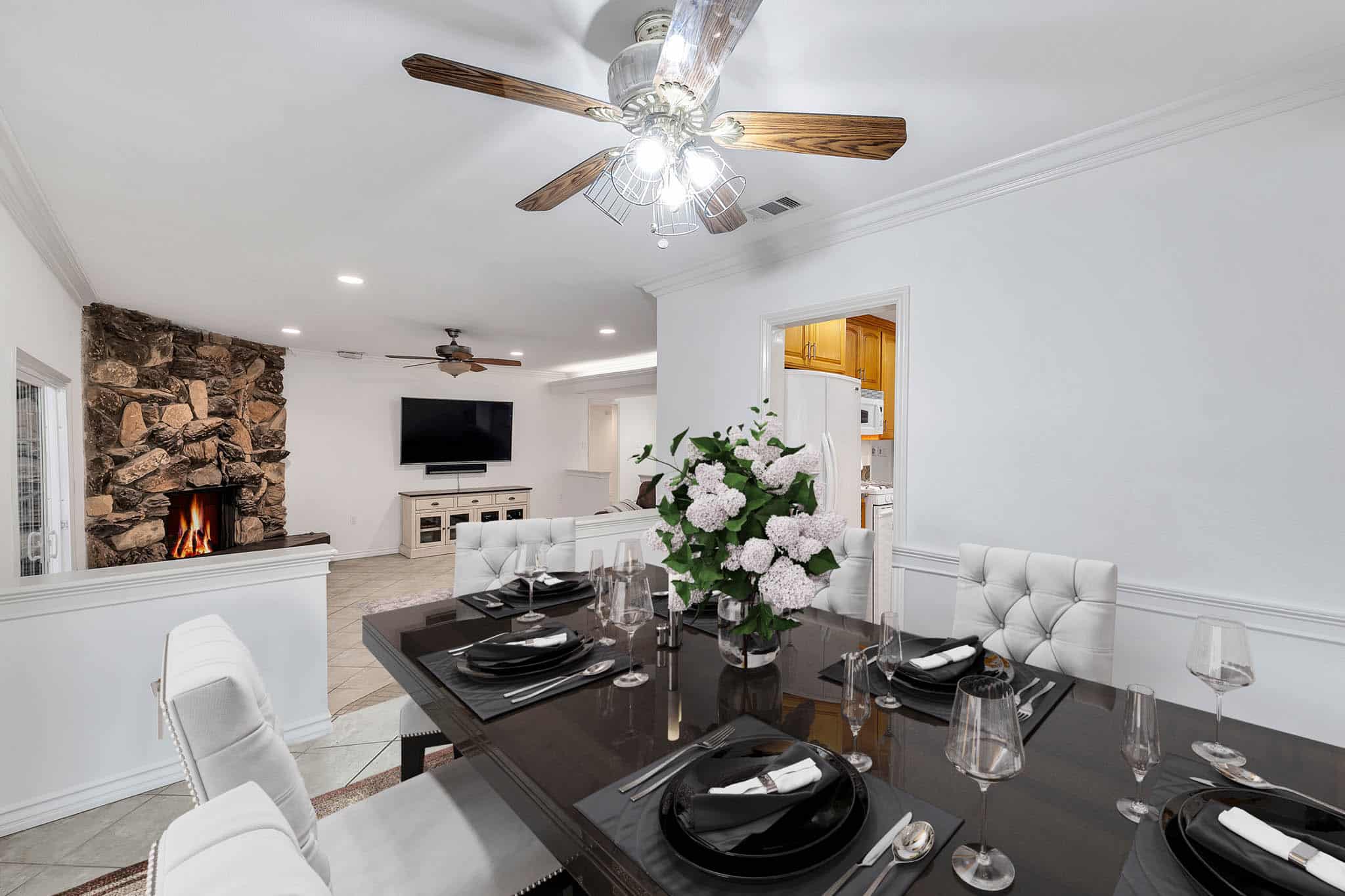 A beautiful living room, a family room with a fireplace and a formal dining room are laid out in an open floor plan.